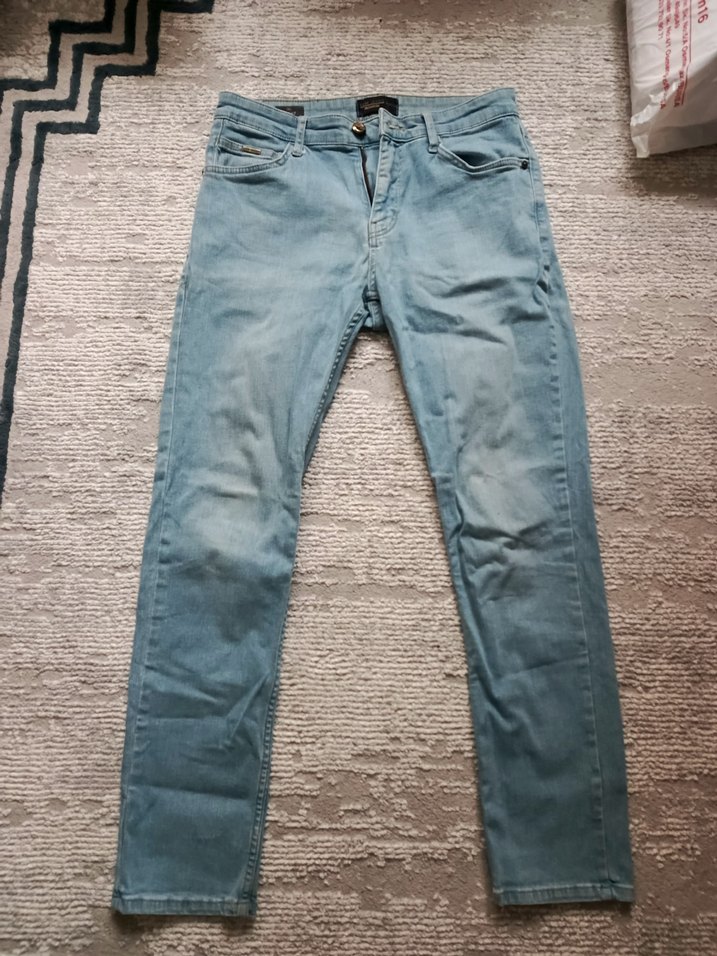 Mavi denim kumaştan, regular fit ve normal boyda, desensiz pastel renkte erkek pantolon. Günlük kullanıma uygun, rahat ve şık bir sokak stili sunar.