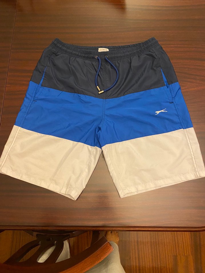 Erkekler için koyu mavi ve bej renk bloklu, kemerli ve regular fit kısa şort mayo.