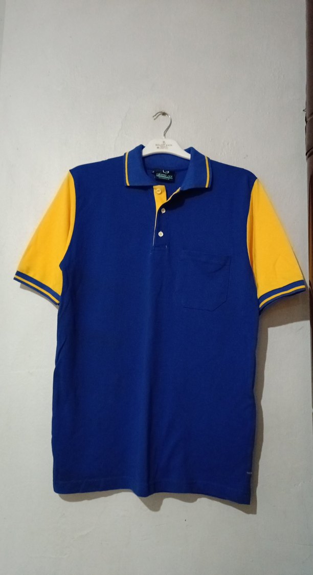Erkekler içinyeni ürün polo tişört, yakalı ve düğmeli, kısa sarı kolları mavi gövdeyle kontrast oluşturur. Düz renk, regular fit ve sentetik kumaş kullanılmamış bir kez dahii. ölçüm iki kolarasi 52 cm o.uz aşağı ölçüm 76 cm