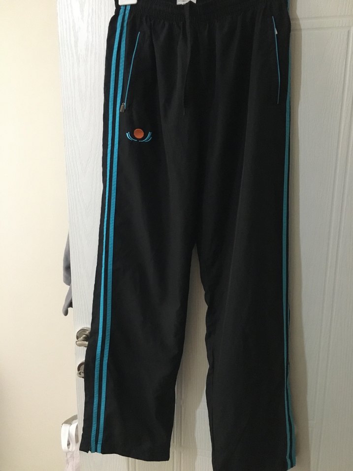 Erkek için, fermuarlı cepler ve yanlarda mavi şeritler bulunan bol kesim eşofman altı. Yumuşak ve sıcak kumaştan üretilmiştir.