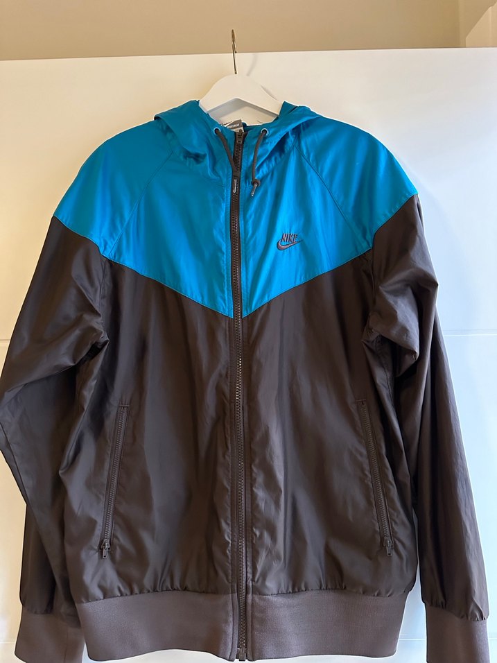 Nike markalı, mavi ve siyah renk bloklu, sentetik kumaştan yapılmış, fermuarlı ve kapüşonlu erkek rüzgarlık. Rahat kesimi ve uzun kollarıyla dış mekan için uygundur. Hiç giyilmedi dar değil m bedene de olur unisex
