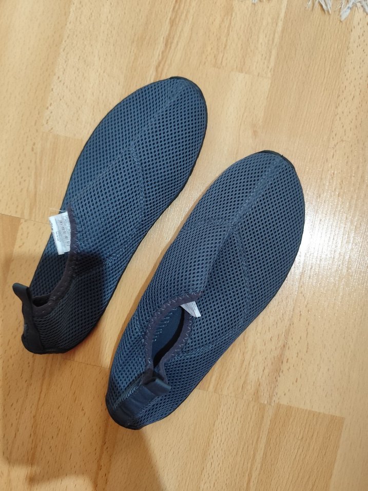 Nefes alabilen kauçuk üst yüzeye ve Velcro kapamaya sahip mavi erkek su ayakkabısı. Spor ve günlük kullanım için uygundur, sade normcore tarzda.