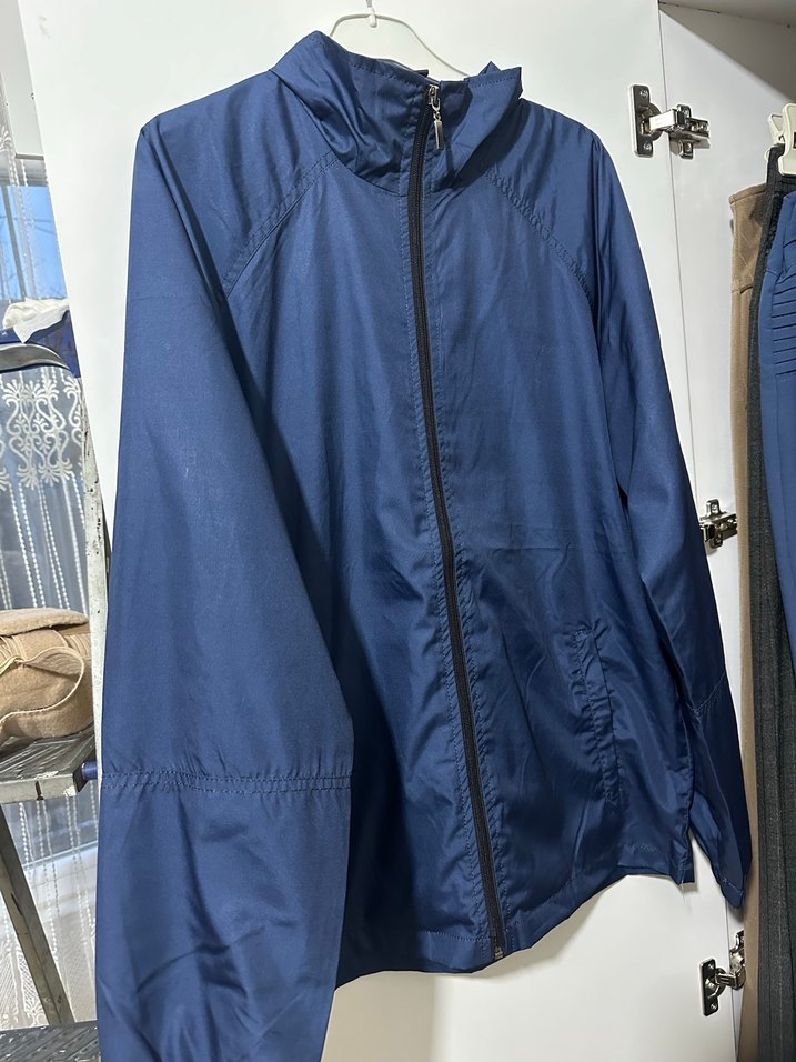 Erkekler için yüksek yakalı, fermuarlı, uzun kollu, parlak mavi renkli, bol kesim streetwear yağmurluk. Outdoor kullanıma uygun.