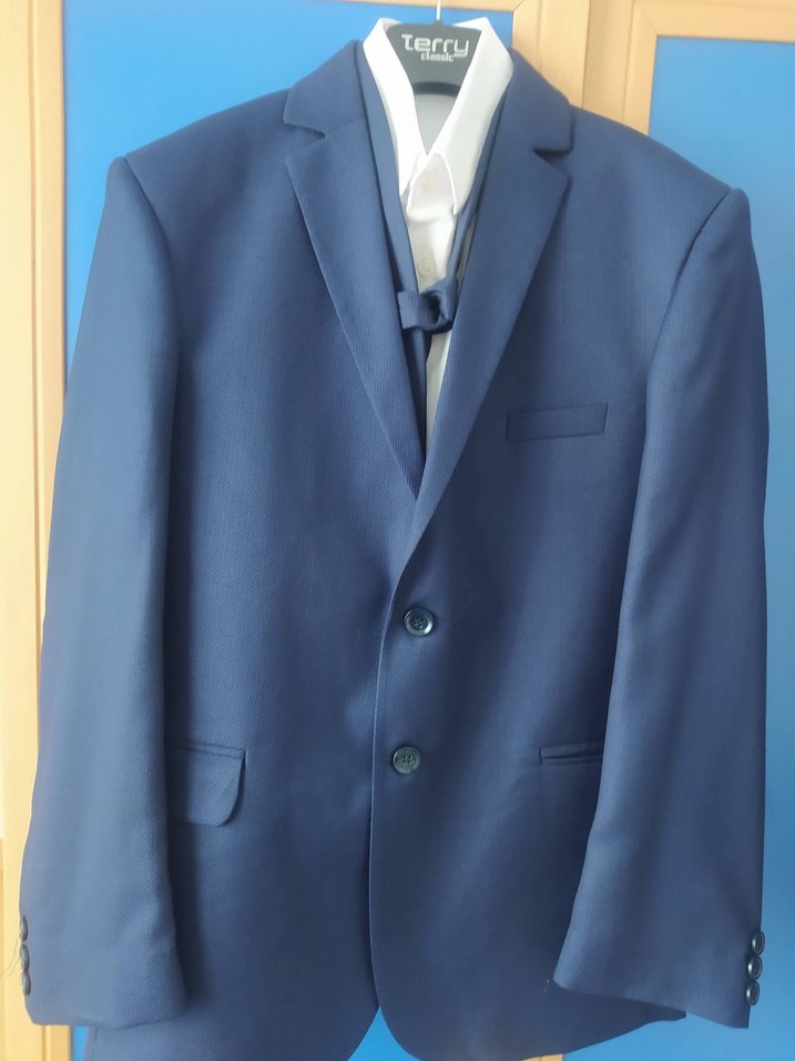 Mavi renkte, kesik yaka ve düğmeli ön kısmı olan, uzun kollu, regular fit erkek takım elbisesi. Ofis kullanımı için uygundur, modern klasik tarzda. ️