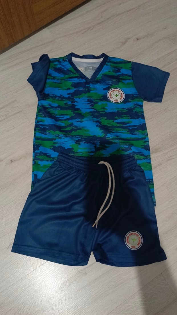 Orjinal Rizespor Forması 1 defa kullanıldı. Erkekler için bol kesim, kısa kollu, mavi tie-dye desenli, düğmeli tişört ve bağcıklı koyu mavi şort seti. Sentetik kumaştan, outdoor sokak stiline uygun.