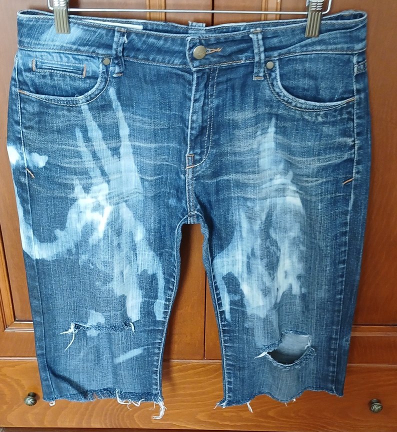 Mavi denim kumaştan, tie-dye desenli ve bol kesim midi şort. Tokalı detay ve günlük kullanıma uygun. bel 43 ,boyu 66 ,paça eni 22 cm dir. taşlanmış ve yırtık bölümleri orijinal durumudur.