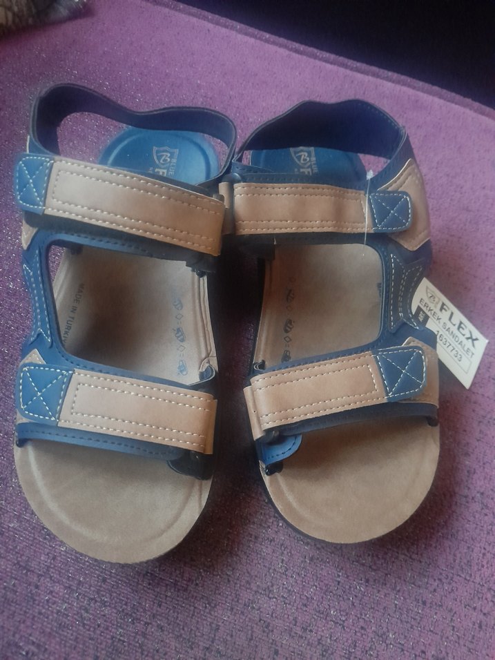 Mavi ve bej renkli, tokalı, rahat deri malzemeden yapılmış erkek sandaletleri, günlük kullanım için uygundur.