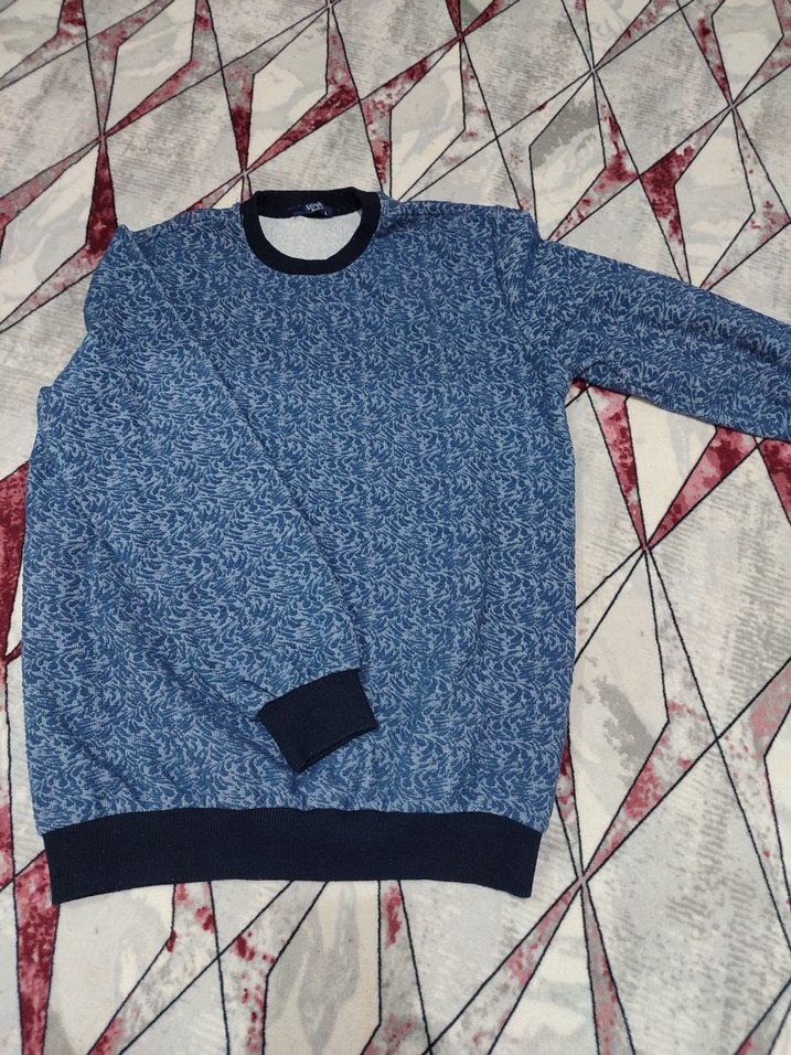 Erkekler için uzun kollu, bisiklet yaka, mavi tonlarında triko denim kumaştan yapılmış bol kesim sweatshirt. Günlük ve sokak stiline uygun. 1.80 85 kilo ile giyildi