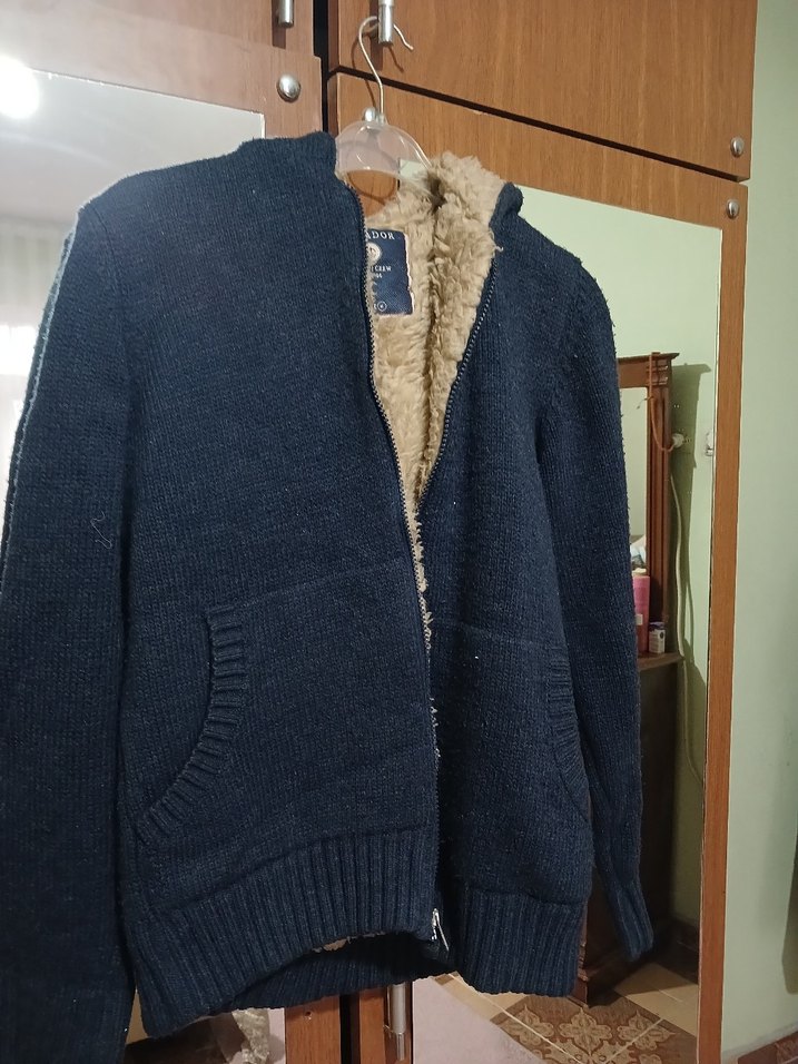 Erkekler için mavi renkli, yün triko hırka. Dar kesim, uzun kollu ve yakası kesimli. Orta uzunlukta ve içi yumuşak astarlı. önde defo var günlük giyebilir siniz