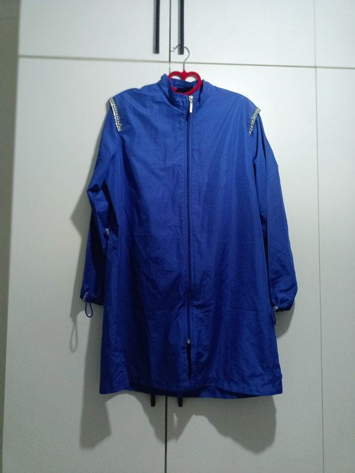 Fermuarlı ön kısmı ve yüksek yakası olan uzun mavi omuz detayları taşlı tesettur haşema, sayılı kullanilmistir hiç bir sorunu yok, marka temsili