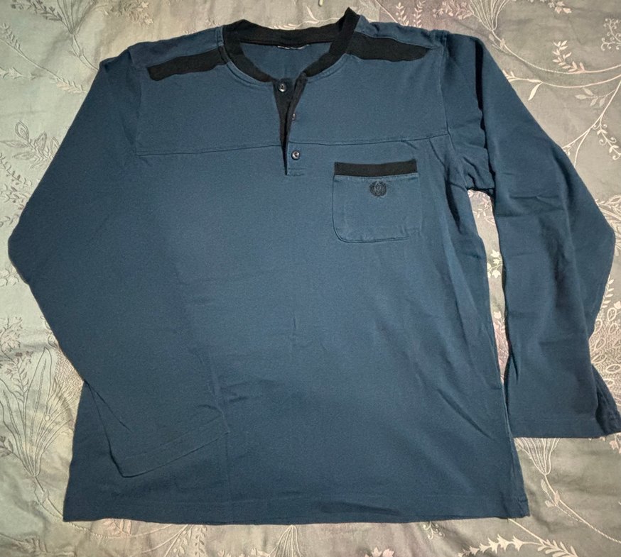 Erkekler için uzun kollu, düğmeli ve bisiklet yaka pijama takımı. Koyu mavi renkte, cep detaylı ve sentetik kumaştan üretilmiştir. Rahat kesimlidir.