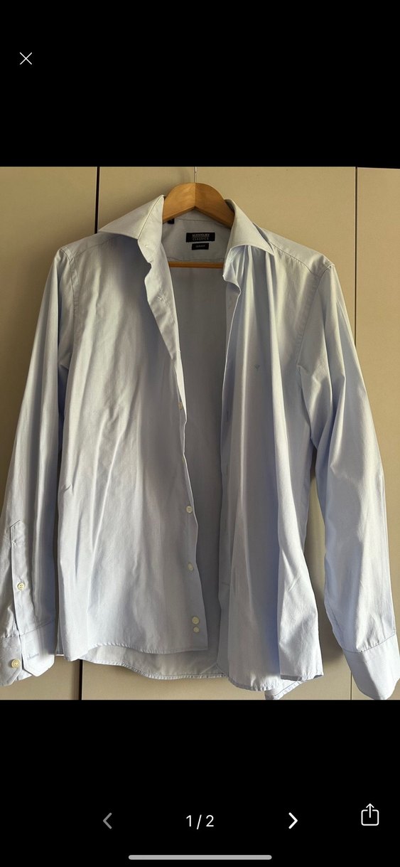 Erkek düğmeli ve yakalı uzun kollu gömlek. Slimfit kesim açık mavi tonlarında, iş ve günlük kullanıma uygun.