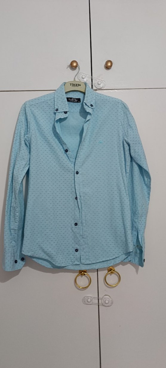 göründüğü gibidir Erkekler için uzun kollu, düğmeli ve yakalı pamuklu gömlek. Pastel mavi renkte, rahat ve normal kesim, günlük sokak stiline uygundur.