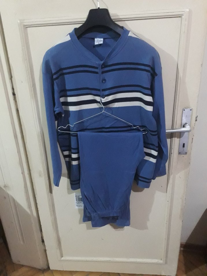 Erkekler için mavi uzun kollu, triko kumaştan, yuvarlak yaka ve bol kesim pijama takımı. Üstte ince çizgili detaylar bulunur, pantolon uzun boydadır. Rahat ve gündelik tarz için uygundur.
