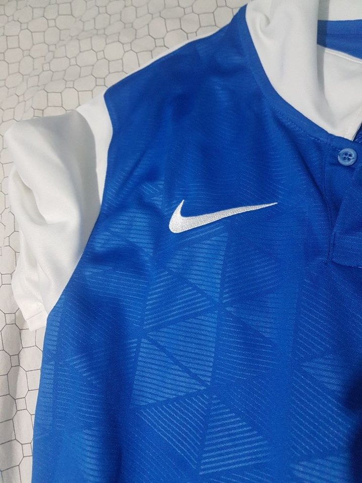 Mavi, düğmeli ve V yakalı erkek spor forması. Parlak sentetik kumaştan, kolsuz ve dar kesim. Nike logosu göğüste yer alır.