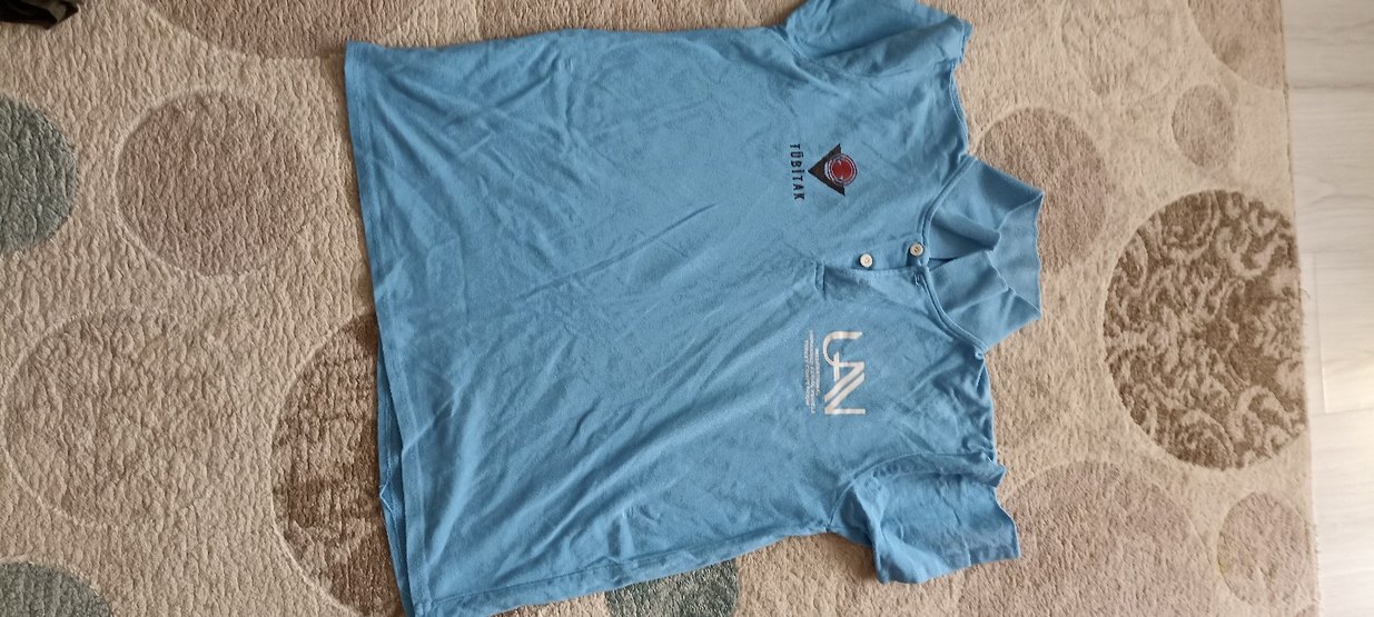 Erkek kısa kollu, V yaka, mavi renkte, yumuşak ve sıcak kumaştan yapılmış, baskılı detaylı ve düğmeli polo tişört. Gri baskılar ve trend sokak stiline uygun kesim içerir.