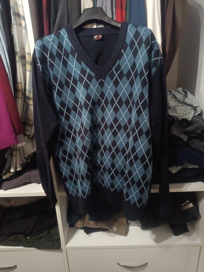 Mavi argyle desenli, V yaka ve bol kesim uzun kollu erkek triko kazak. Yumuşak sentetik kumaştan hazırlanmıştır, günlük rahat kombinlere uygundur.