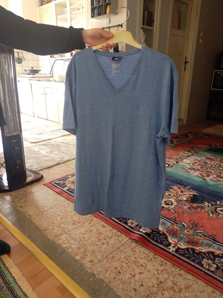 Erkekler için mavi renkli, denim kumaştan yapılmış, rahat kesim ve kısa kollu V yakalı tişört. Desensiz ve normal boyda, günlük kullanıma uygundur.