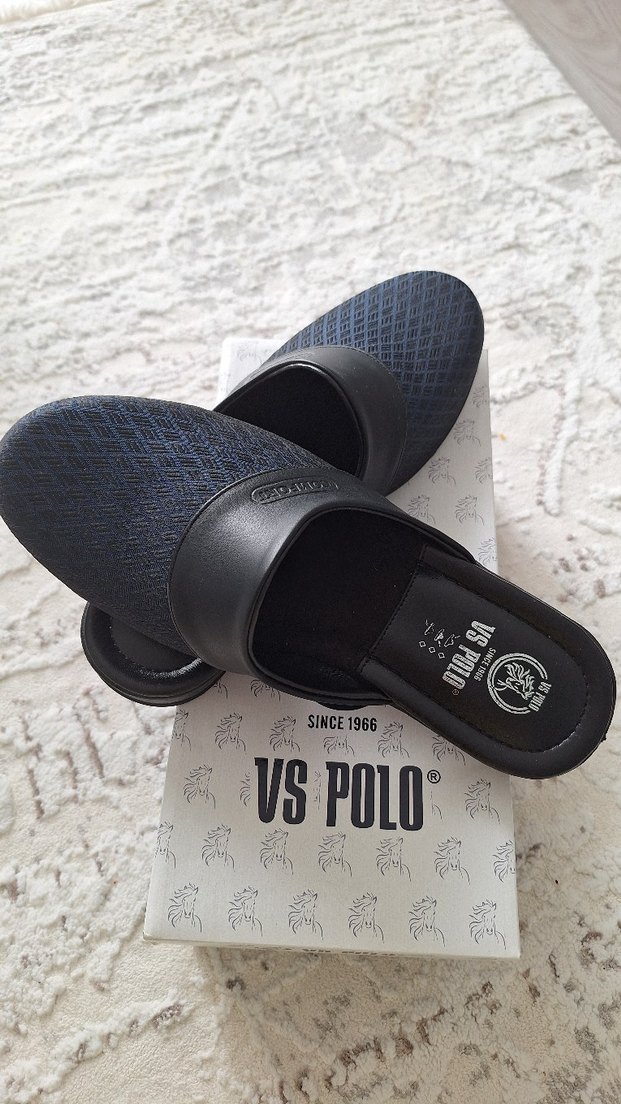 Koyu mavi renkli, 43 numara, Velcro bantlı, rahat tabanlı erkek ev terliği. Marka: VS Polo. Eşime nişan bohçası için almıştım ama eşim terlik kullanmiyor o yüzden kutusuyla beklemede kaldı o sebeple satıyorum.