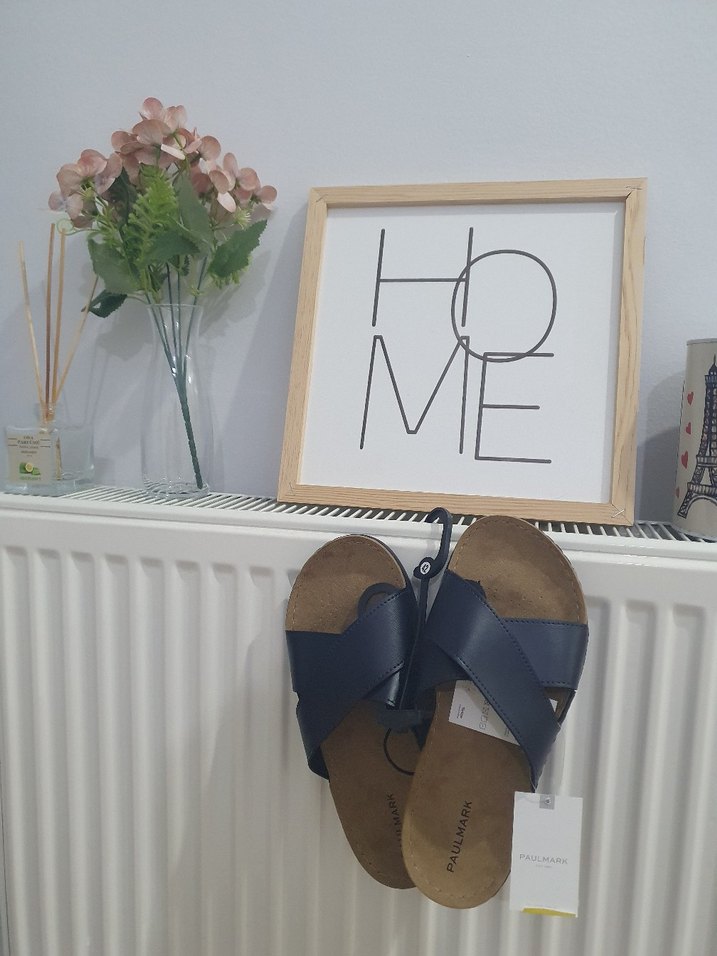 Mavi renkli, baskılı erkek terlik. Kolay ayar için velcro bantlı, kauçuk malzemeden üretilmiş, minimalist ve rahat ev kullanımı için uygun.