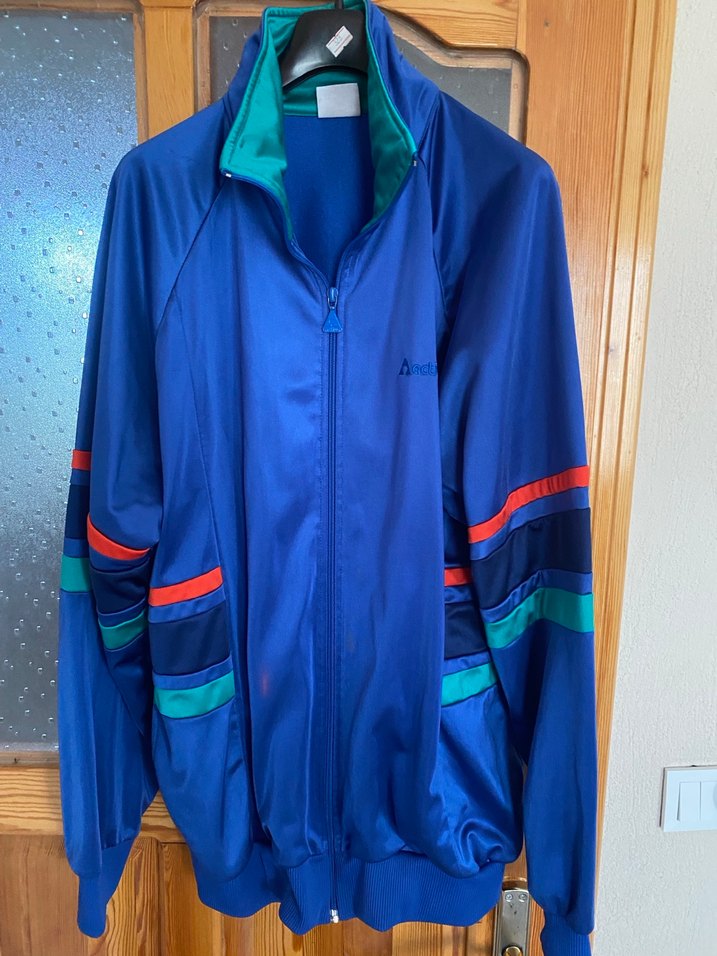 Erkekler için fermuarlı, parlak mavi renkte, yüksek yakalı ve uzun kollu vintage spor ceket. Renkli şerit detaylarıyla şık ve rahat bir görünüm sunar.