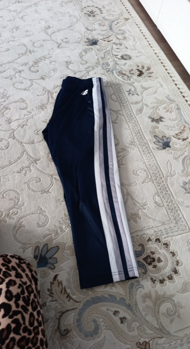 Erkekler için mavi renkli, yanlarında beyaz şerit bulunan, elastik bel bantlı ve rahat kesimli eşofman altı.