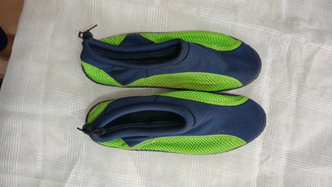 Erkekler için mavi ve yeşil renkte, velcro kapamalı, kauçuk malzemeden yapılmış spor ve sokak stiline uygun su ayakkabısı. Rahat ve sade tasarım.