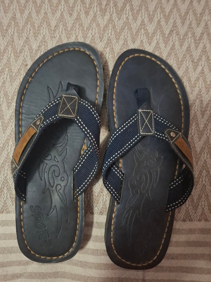Koyu mavi yılan desenli, tokalı erkek sandalet. Bohem tarzda, kauçuk tabanlı ve günlük kullanım için uygun.