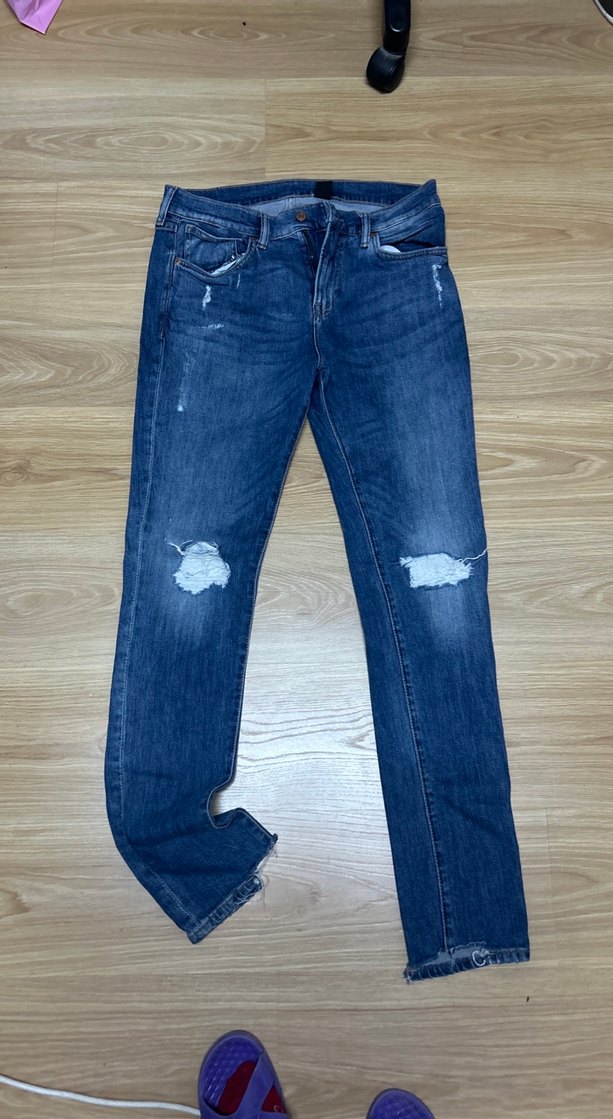 Erkekler için bol kesim ve normal boyda, yırtık detaylı denim kot pantolon. Parlak mavi renkte, gündelik ve normcore tarzında, trend bir model.