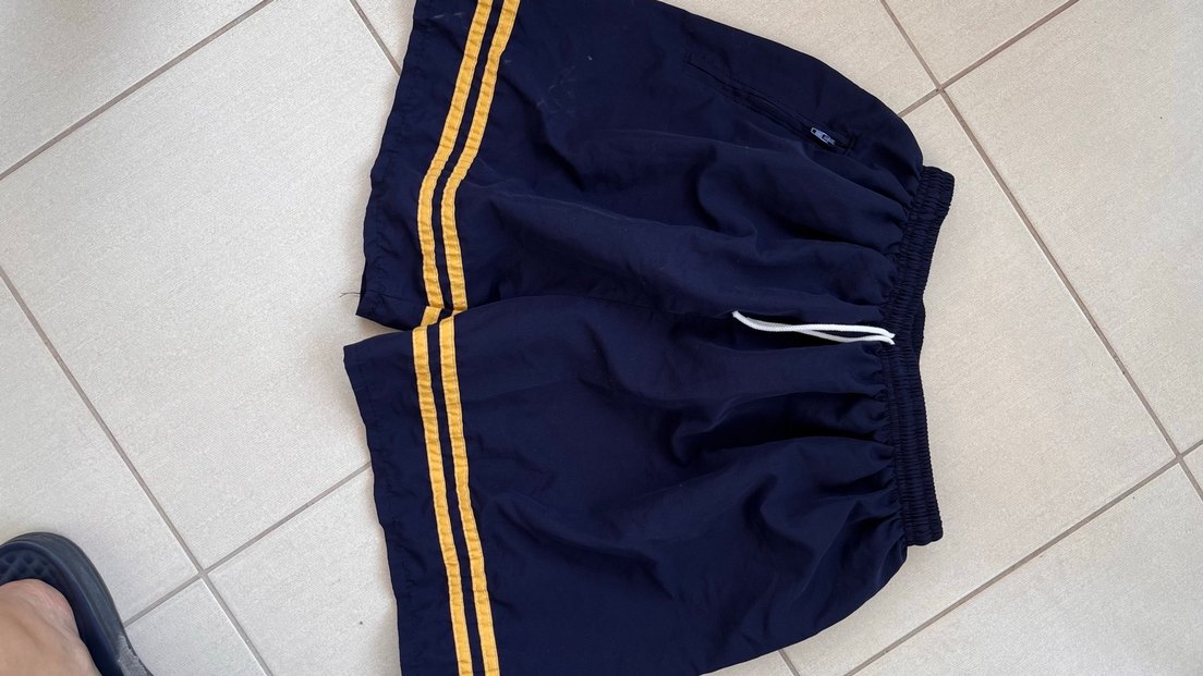 Parlak mavi renkli, sarı yan şerit detaylı erkek çocuk mayo şortu. Rahat ve yüzme için uygun.