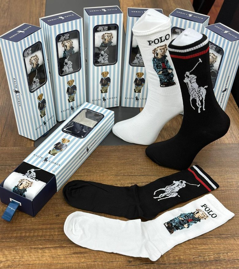 Beyaz ve siyah renklerde, Polo baskılı ve "POLO" yazılı, kısa boylu, fit kesim erkek çorapları. Çizgili kutuda sunulur.