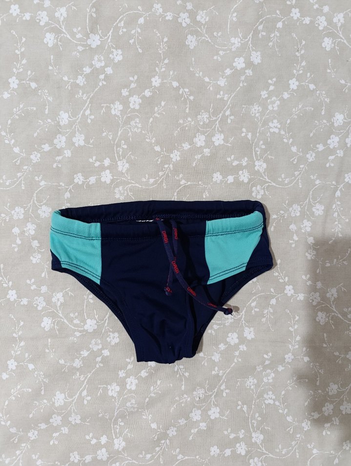 Lacivert ve turkuaz yan panelli, elastik bel bantlı, sıkı oturan erkek mini yüzme şortu, plaj için uygun.