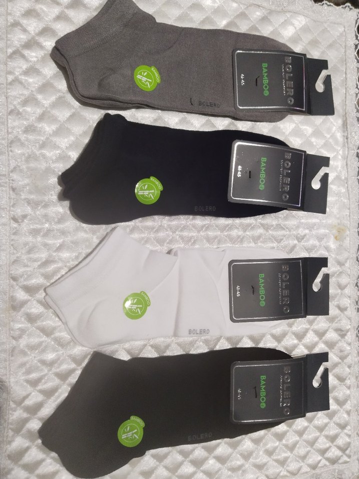 Gri, siyah ve beyaz renklerde, rahat kesim, kısa uzunlukta erkek çorap seti. Nefes alabilen bambu kumaştan üretilmiştir.