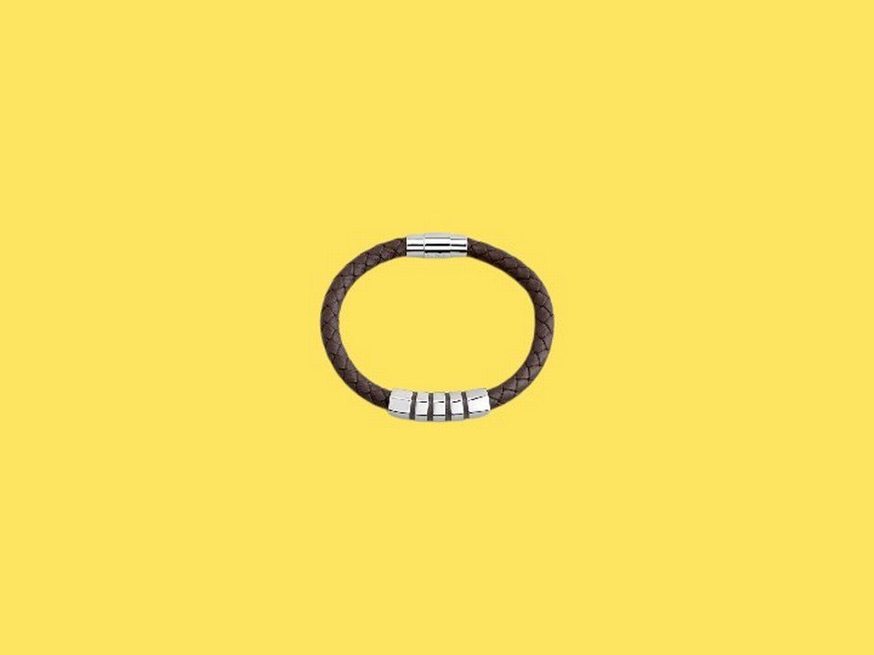 Erkekler için minimalist tasarımlı, kahverengi örgü deri ve gümüş renkli metal detaylı bileklik.