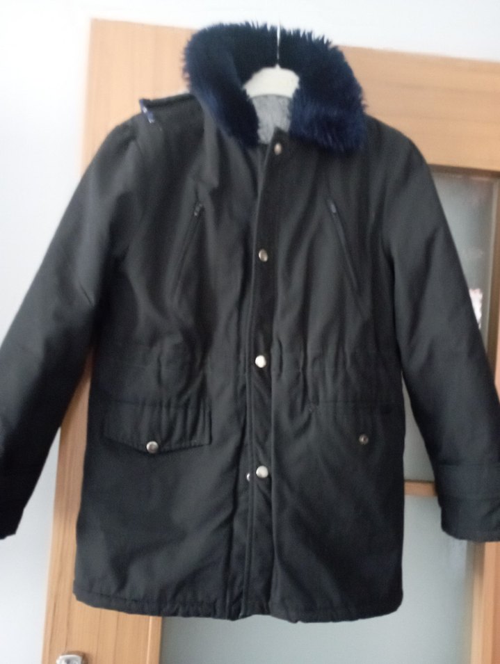 siyah, dışı kalın keten kumaş, içi peluş çok sağlam sorunsuz erkek mont