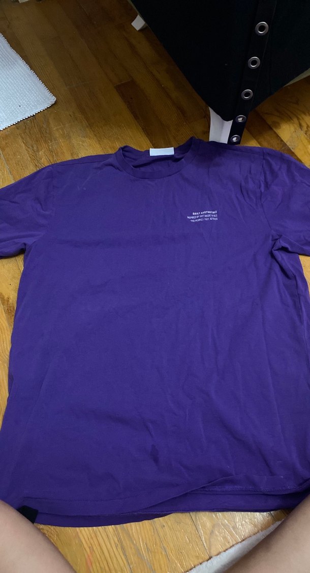 Erkek tişörtü, kısa kollu ve yuvarlak yakalıdır, koyu mor renkte ve baskılıdır. Rahat kesimiyle günlük kullanıma uygundur.