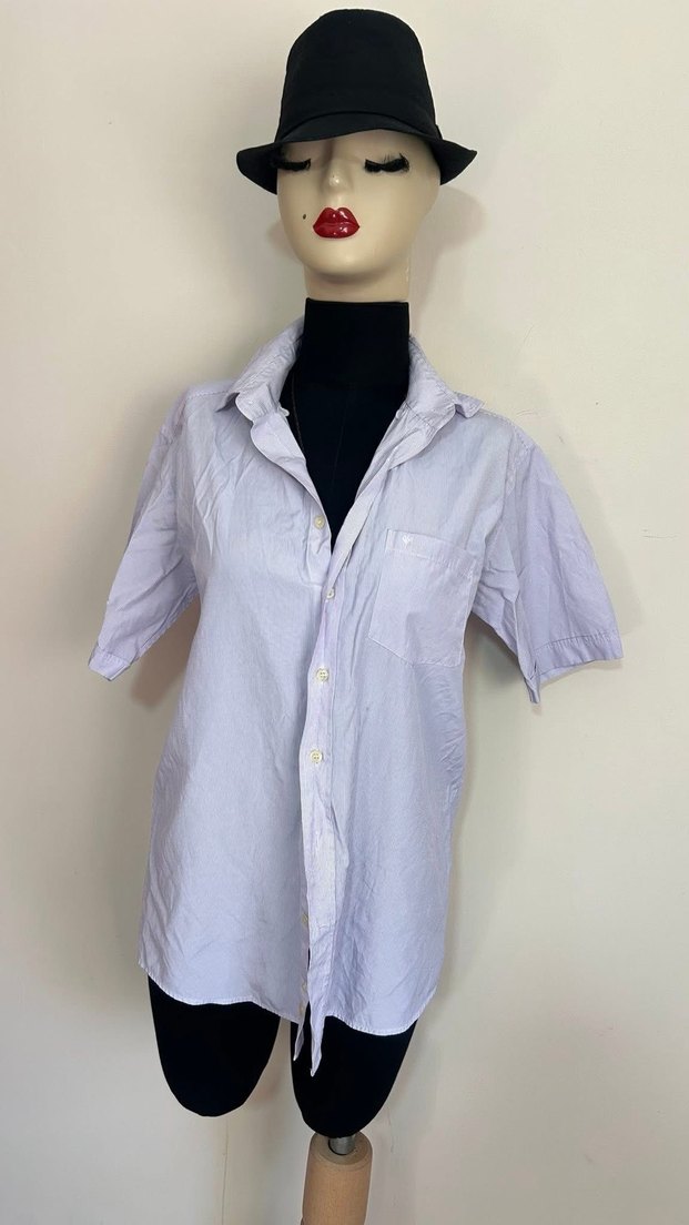 Erkekler için keten kumaştan, gevşek kesim, kısa kollu ve yakalı mor tonlarında gömlek. Önü düğmeli, günlük sokak stili için uygundur.
