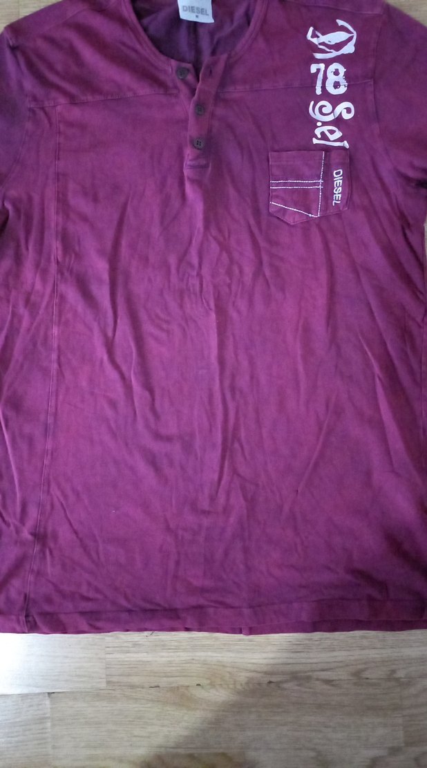 Erkek mor renkli kısa kollu polo tişört, keten kumaştan üretilmiş, rahat ve normal boyda. Cep üzerinde Diesel logosu bulunur, sade ve günlük kullanıma uygun.
