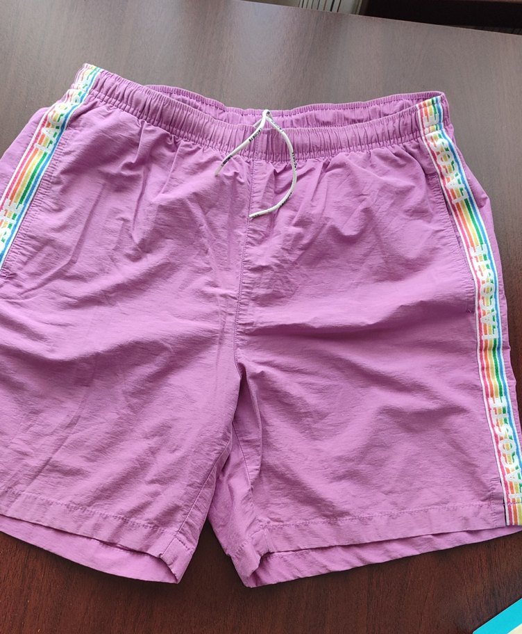 Mor renkli, bol kesim erkek şort. Yanları pastel tonlu bağcıklı şeritlerle süslenmiş, plajda kullanıma uygun rahat bir model.