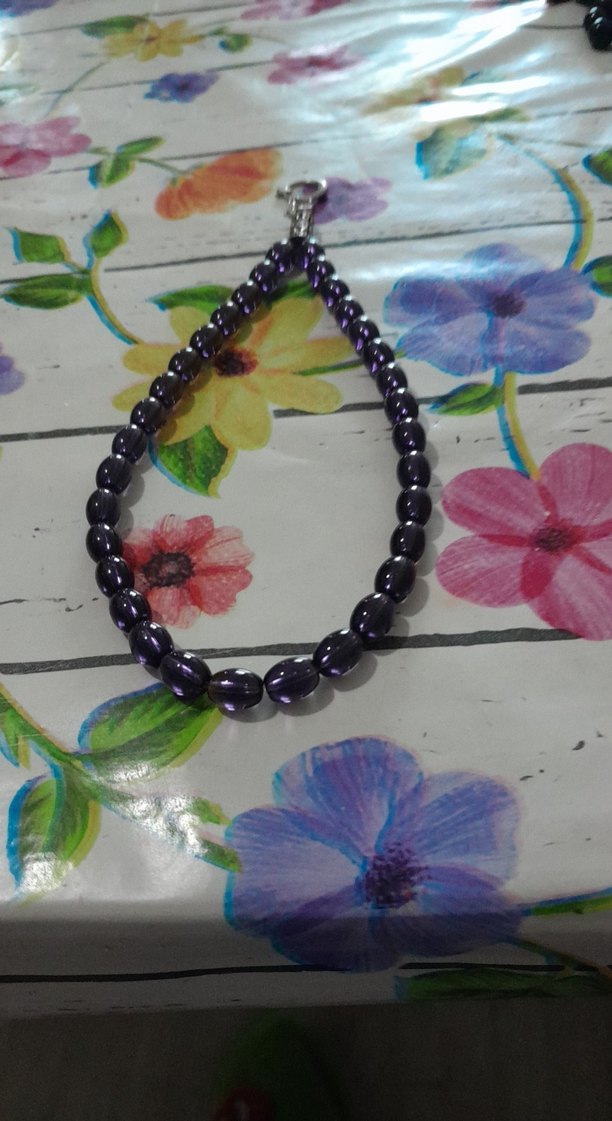 Erkek tesbih mor koyu boncuklardan oluşur, minimalist gotik tarzda metal toka ile sabitlenmiştir.