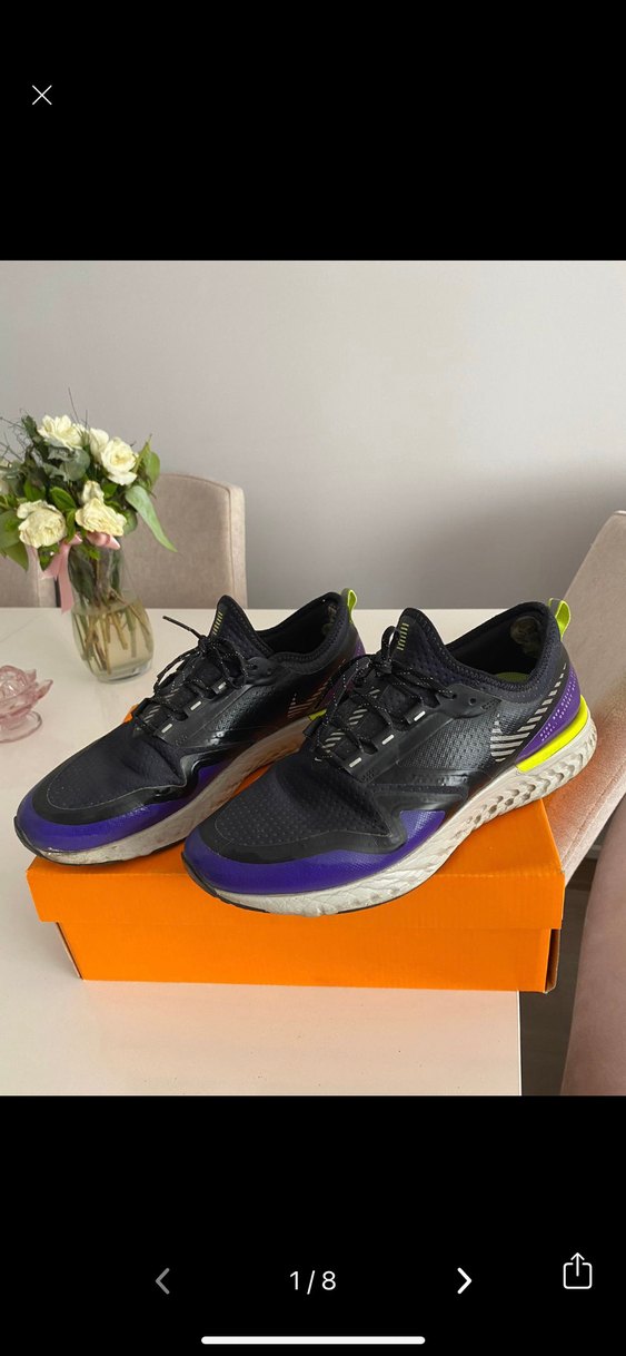 Erkek spor ayakkabısı, mor ve siyah renklerde desenli, Velcro bantlı ve kauçuk tabanlı, sokak stili ve spor kullanıma uygun.
