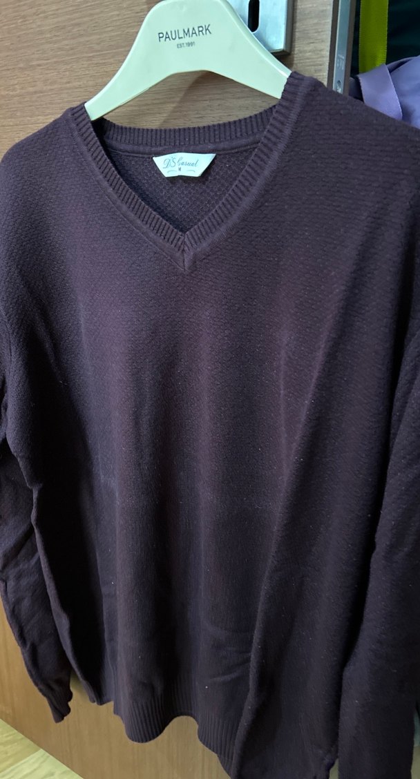 Erkekler için mor renkli, V yaka ve uzun kollu pamuklu triko kazak. Rahat ve bol kesim, günlük sokak stili için uygundur.
