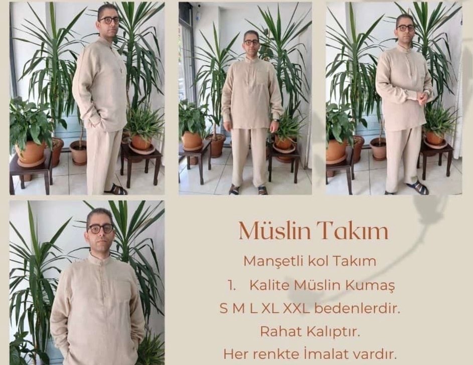Camel renkli erkek müslin takımı, manşetli kısa kollu ve yakası cepli. Rahat kalıplı, etnik desenli, yüksek kaliteli müslin kumaşla üretilmiştir. S-XXL beden aralığında mevcuttur.