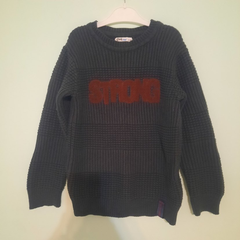 Erkekler için siyah renkli, nakışlı "STRONG" yazılı, uzun kollu, yuvarlak yaka ve bol kesim örgü sweatshirt.