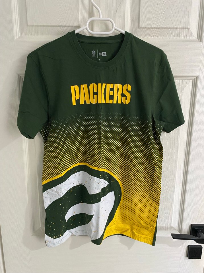 Yeşil renkli, baskılı 'PACKERS' yazılı, kısa kollu ve yuvarlak yakalı erkek spor tişörtü. Sentetik kumaştan, athleisure ve sokak tarzına uygun. Çok iyi durumda herhangi bir deformitesi yoktur.
