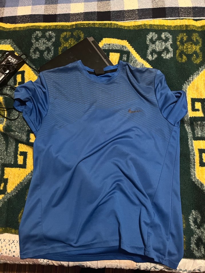 Nike Koyu mavi renkte, kısa kollu ve bisiklet yaka, sentetik kumaştan erkek tişört. Cırt cırt detaylı, spor ve sokak stiline uygun rahat kesim.