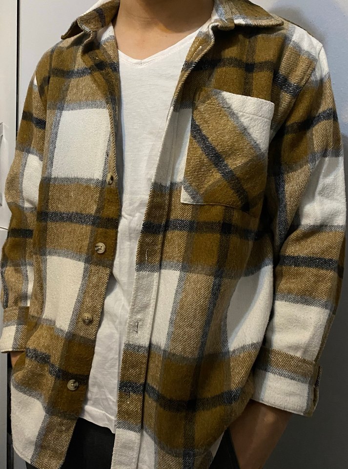 Hafif kahverengi kareli, pamuklu, düğmeli önlü, uzun kollu ve yakası notalı gömlek. Rahat kesim ve normal midi boyda, günlük kullanıma uygun.