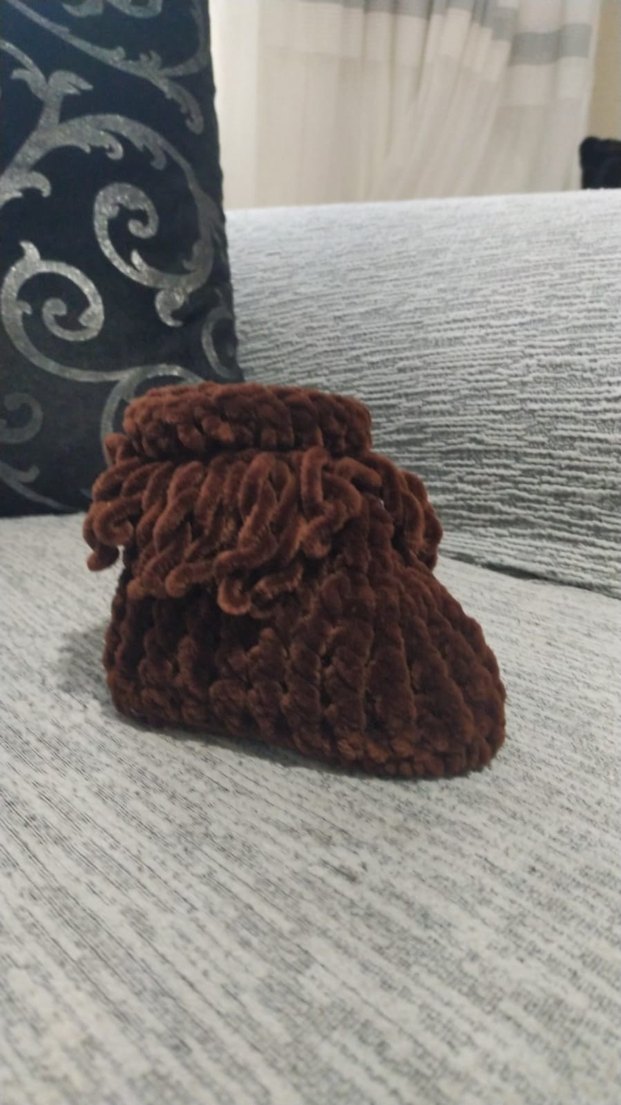 Örgü kahverengi ev botu kadife ipte. bebeğinizin rahatlığı için istenilen numaraya göre yapilir