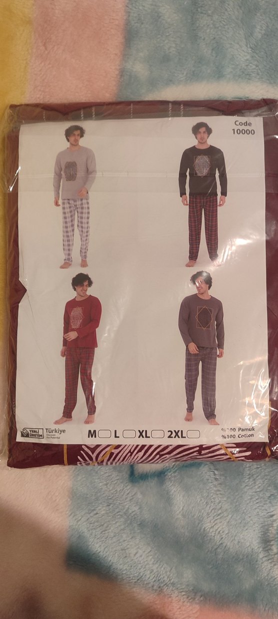 Pamuklu, uzun kollu, baskılı, rahat kesim erkek pijama takımı. Orta boy pantolonları kareli desenlidir. bordo renktedir.