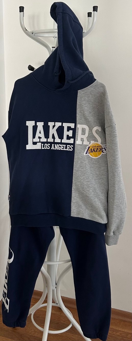 DeFacto NBA marka S beden ( alt boy 102 cm, bel 38 cm lastikli ve bağcıklı, paça altı 14 cm lastikli, üst boy 70 cm, kol 65 cm, koltuk altı 55cm) lacivert- gri renk , içi yünlü, alt yanları ve önü “ Los Angeles Lakers yazılı” detaylı , geniş kesim , kapüşonlu ( 35 cm) erkek pamuklu eşofman takımı . Bir kez denendi. Kullanılmadı.